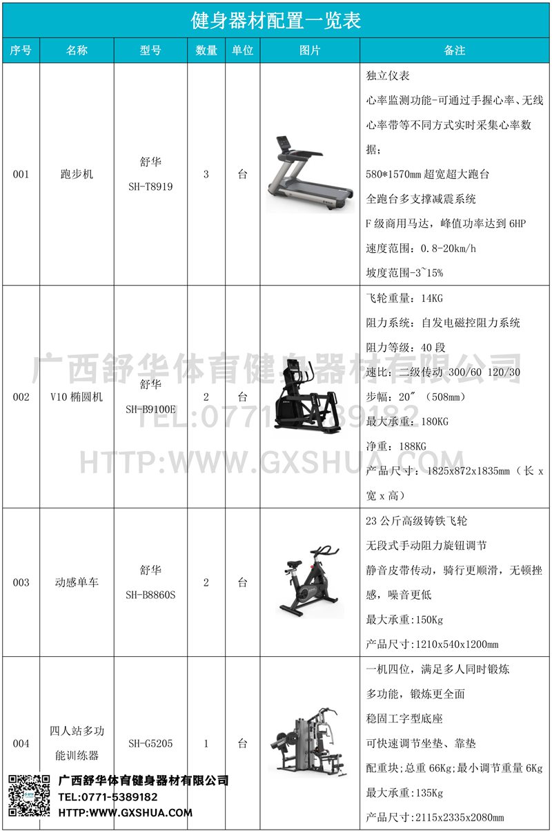 1.huatihuiV9跑步机SH-T8919*3台-独立仪表-简洁大气,全新外观设计,健康运动新选择;心率监测功能,可通过手握心率、无线心率带等不同方式实时采集心率数据;580*1570mm超宽超大跑台-跑感舒适,跑台整体安全稳定;全跑台多支撑减震平台,保证跑台超强支撑力,达到180kg支撑,满足专业健身房需求。F级商用马达-超强马达,AC 3.0HP 交流,峰值功率达到6HP,F级商用品质。速度范围达到0.8-20km/h;V9跑步机可实现跑台扬升功能,坡度范围-3~15%,满足不同的锻炼需求。